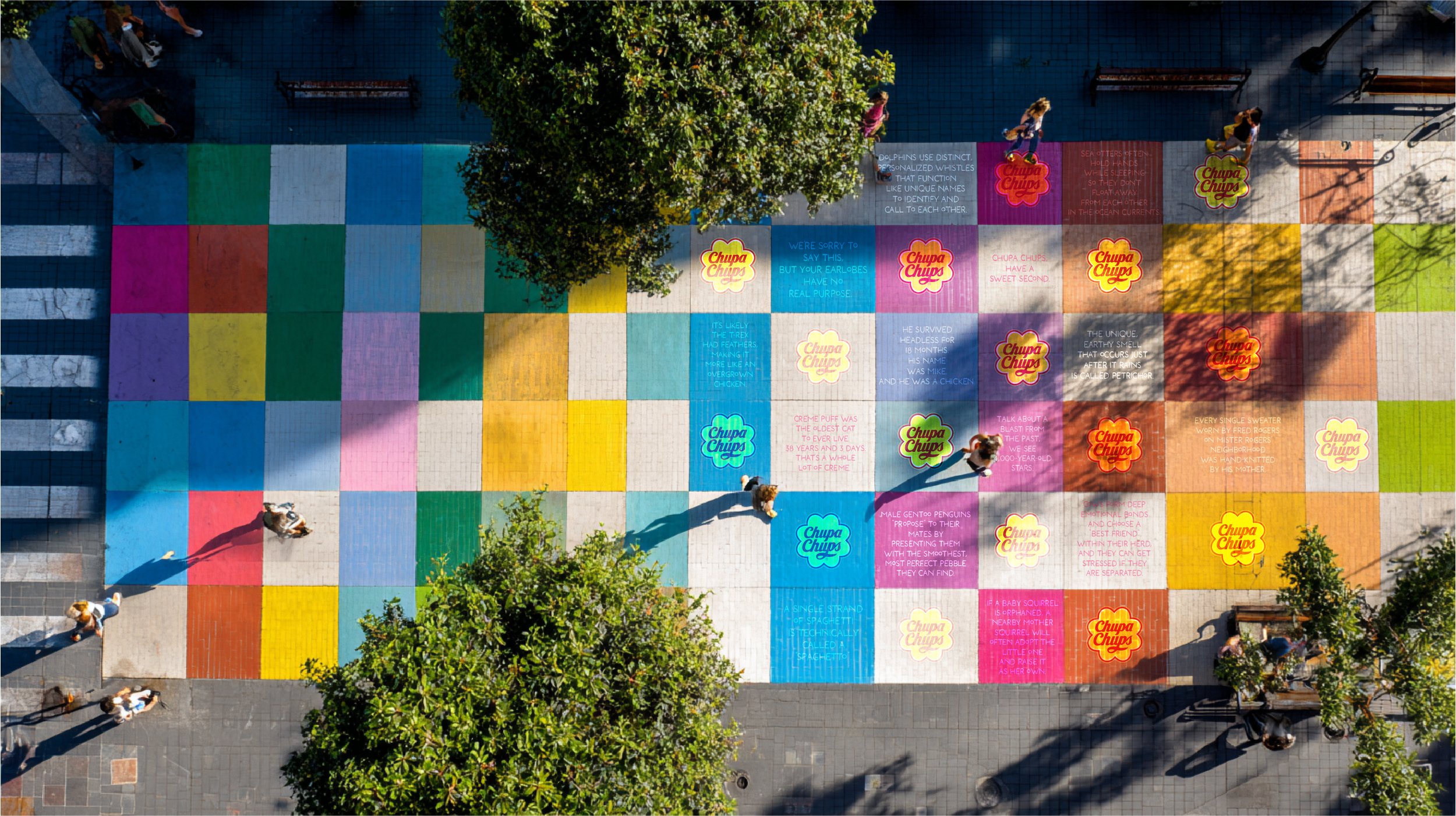 Like squares on a game board, we brightened monotonous commutes with colorful sidewalks chock full of silly distractions.