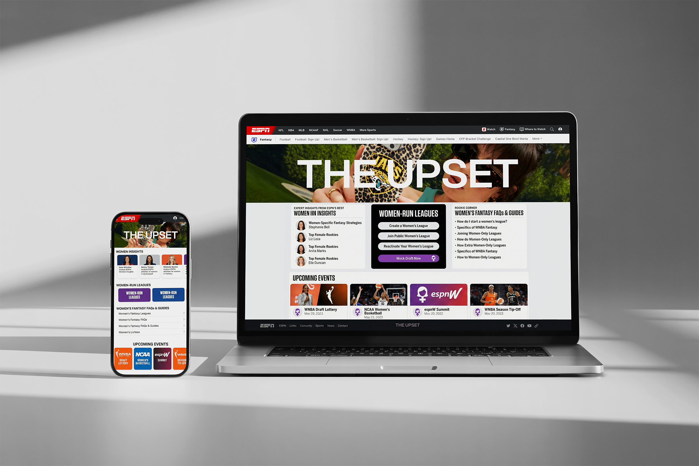 We made a new landing page for ESPN Fantasy, The Upset, to serve as her home base. Here, she’ll find insights by female ESPN analysts, women-run leagues, FAQs for newcomers, and information on upcoming events.